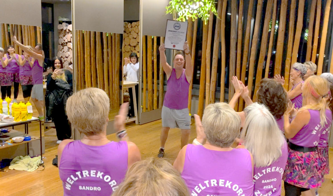 Am 26. Oktober 2024 um 19 Uhr beendete Sandro Blättler seine letzte Unterrichts-Einheit des Tages und erzielt mit genau 10 Stunden den Weltrekord für den »längsten Zumba®-Unterricht mit wechselnden Teilnehmenden«. Direkt im Anschluss wurde Sandro von RID-Rekordrichter Olaf Kuchenbecker mit einer persönlichen Rekordurkunde ausgezeichnet. Wir gratulieren!