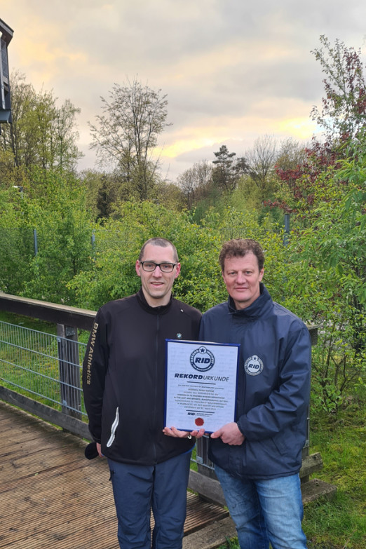Und diesbezüglich war das Endergebnis eindeutig: Mit seinen Läufen erzielte Anthony Peter Konrad insgesamt 2.924 Höhenmeter. RID-Rekordrichter Maik Kaufmann zertifizierte die neue Bestleistung der Kategorie »meiste in 12 Stunden erzielte Höhenmeter zu Fuß (auf- und abwärts, Aussichtsturm)« an Ort und Stelle und zeichnete den erschöpften, aber umso glücklicheren Neu-Rekordler mit seiner wohlverdienten RID-Rekordurkunde aus. Auch Waldbröls Bürgermeisterin Larissa Weber war zum Aussichtsturm gekommen, um dem erfolgreichen Sportler persönlich zu gratulieren.