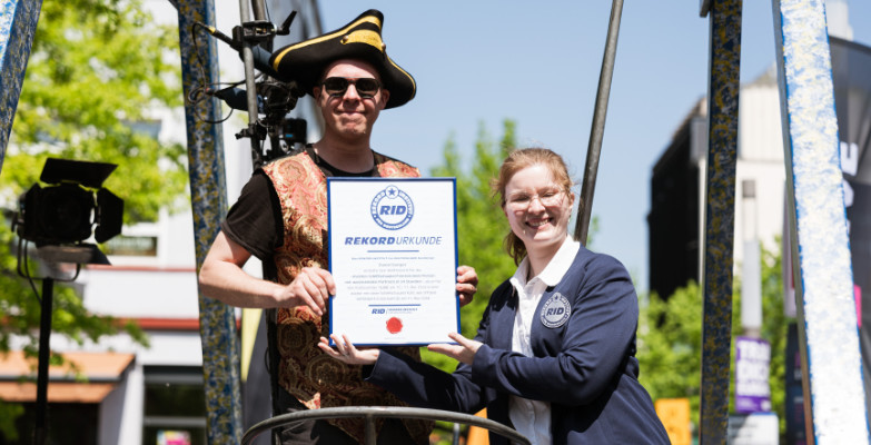 Rekordrichterin Kuchenbecker zertifizierte den neuen Weltrekord für die »meisten Schiffschaukel-Fahrten einer Person mit wechselnden Partnern in 24 Stunden« mit dem Endergebnis von 250 Personen. Erschöpft, aber glücklich nahm Daniel Danger mit zitternden Händen seine verdiente RID-Rekordurkunde entgegen. Wir sind schon gespannt auf seine nächste Rekord-Herausforderung.Fotos: Felix Hanebeck (1); Timo Grau (2); 1LIVE (2); RID (2)