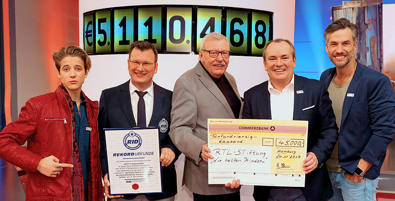 45.000 EUR war die mit dem Weltrekord gesammelte Spendensumme zu Gunsten der »Stiftung RTL – Wir helfen Kindern e.V.«, die am 24. November 2017 im RTL-Spendenmarathon-TV-Studio in Köln mit der Übergabe eines Schecks bestätigt wurde. Auch die offizielle Rekordurkunde zur Anerkennung des Weltrekords wurde dort stellvertretend für alle Teilnehmer an die Organisatoren überreicht.