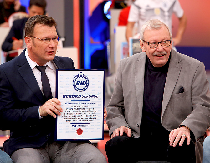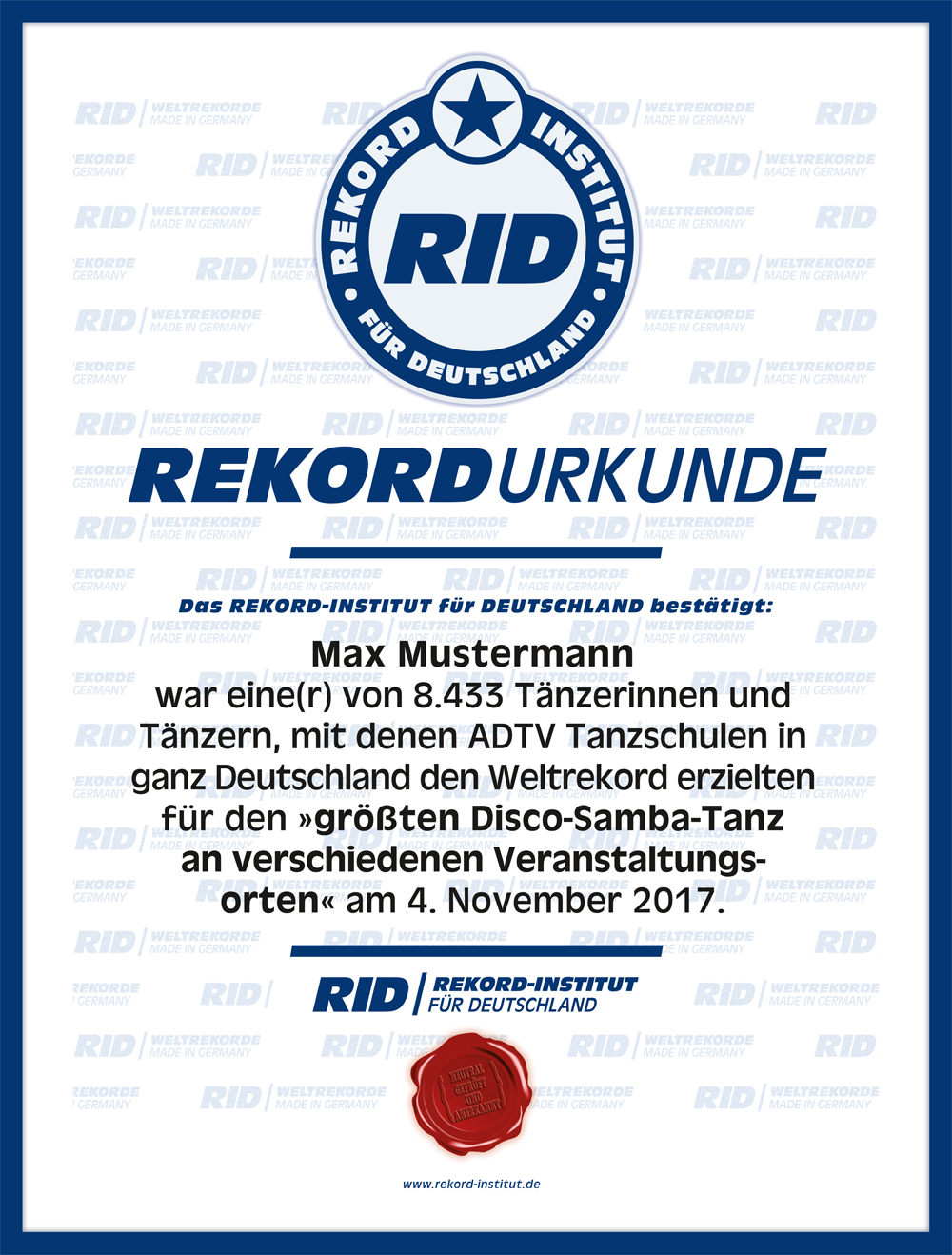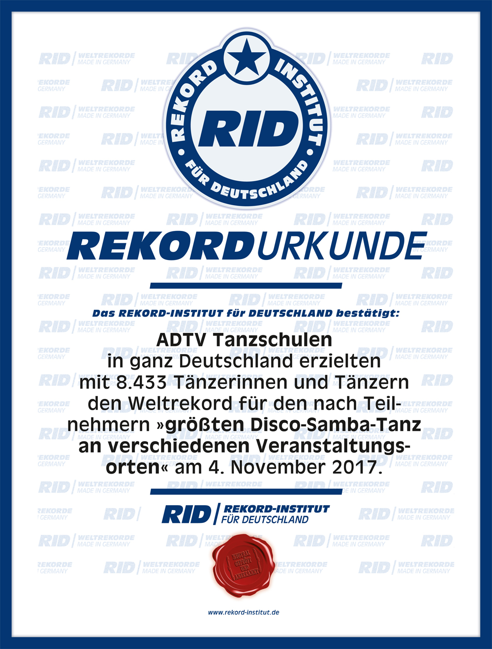 Für den Erstrekord im nach Teilnehmern »größten Disco-Samba-Tanz an verschiedenen Veranstaltungsorten« hatte das Rekord-Institut für Deutschland mindestens 6.250 Teilnehmer an 25 Veranstaltungsorten vorausgesetzt. Beide Vorgaben wurden übertroffen, und der neue Weltrekord mit 8.433 Tänzerinnen und Tänzern in das RID-Rekordarchiv eingetragen.