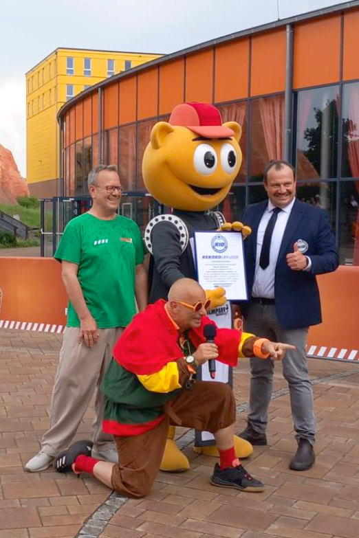 Sogar 380 Teilnehmende kamen in Babelsberg zusammen und formten regelgerecht das »größte Maskottchen-Bild aus Menschen«. Aus der Vogelperspektive fotografiert und geprüft wurde das Bild von RID-Rekordrichter Lasse Philipeit als Weltrekord bestätigt und zertifiziert. Zudem wurde Andrej Baranow, der künstlerische Leiter des Filmparks Babelsberg mit der offiziellen RID-Rekordurkunde ausgezeichnet.Auch ein heftiger Platzregen konnte die Beteiligten nicht davon abhalten, die für den Weltrekord erforderlichen 5 Minuten als Maskottchen-Bild auszuharren. Wir freuen uns über so viel Einsatz und den erfolgreichen neuen Weltrekord!