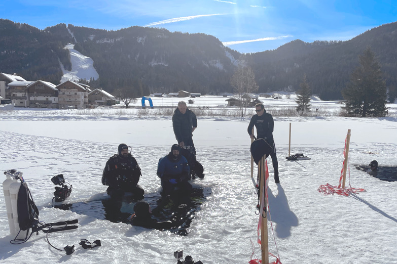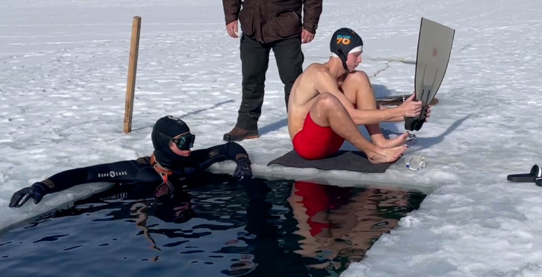 Rekordrichter Olaf Kuchenbecker hatte ebenfalls den langen Weg aus Norddeutschland auf sich genommen, richtete seinen Blick aber unter die Eisschicht. Denn organisiert und angeleitet vom Österreichischen RID-Rekordhalter und Mental-Coach Christian Redl wollte Christoph Strobl dort einen Rekordversuch wagen. Begleitet wurde er vom US-Amerikaner Michael Donaldson. Das Besondere: der deutlich jüngere Strobl hatte dem 83-jährigen Donaldson erst vier Jahre zuvor das Schwimmen beigebracht. Kennengelernt hatten sich der angehende Psychologe Strobl und der Filmrechte-Anwalt Donaldson in den USA, wohin Strobl 2020 auswanderte. Ein Glücksfall, denn nun motivierte der Senior-Schüler seinen Lehrer, den Weltrekordversuch tatsächlich zu wagen.