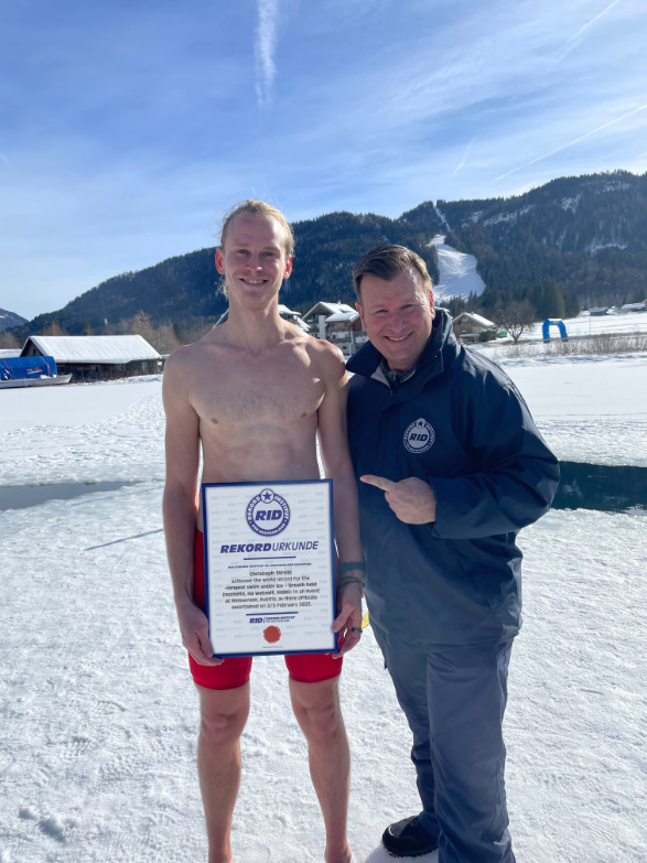 Und so stieg Strobl ohne wärmenden Neoprenanzug ins Wasser, ausgerüstet mit einer Monoflosse – einer Schwimmflosse, die die Füße Delfinartig miteinander verbindet – und tauchte unter die Eisfläche ab. Mindestens 70 Meter weit musste er tauchen, um den Weltrekord zu holen. Sollte dem Wahl-Amerikaner diese Distanz mit nur einem Atemzug gelingen?Begleitet von Redl und weiteren Rettungstauchern mit Sauerstoffflaschen schwamm Strobl unter der undurchdringlichen Eisschicht dahin, um an einem der zuvor gesägten Löcher aufzutauchen. Kuchenbecker sprintete vom Einstiegs-Eisloch direkt nach Strobls Abtauchen zum Ausstieg. Dort ließ er den Neu-Rekordhalter nicht lange zittern und zeichnete ihn umgehend mit der begehrten RID-Rekordurkunde aus: mit 70,14 im eiskalten Wasser zurückgelegten Metern erzielt Christoph Strobl den Weltrekord für die »weiteste mit Mono-Flosse unter Eis getauchte Strecke ohne Neoprenanzug (Herren)«.