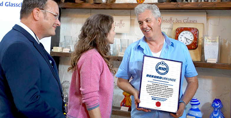 Kurz darauf überreicht RID-Rekordrichter Olaf Kuchenbecker die offizielle Rekordurkunde und bestätigt damit: Fred M. erzielt mit 1.100 zurückgelegten Metern den offiziellen Weltrekord für die »weiteste in einer Stunde barfuß auf Glasscherben zurückgelegte Distanz«. Der Bayer holte also »seinen« Weltrekord erfolgreich zurück nach Deutschland.