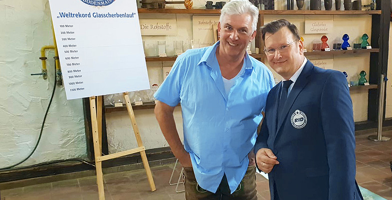 Bodenmais in Niederbayern ist bekannt für seine Glashüttentradition und insofern perfekt für das geplante Rekordvorhaben geeignet. An einem sonnigen Sonntag im August trafen sich das Fernsehteam von »Heimat der Rekorde« (BR, D) nebst Moderatorin Claudia Pupeter, Rekordjäger Fred M. sowie RID-Rekordrichter Olaf Kuchenbecker bei Joska-Glas in Bodenmais. Ebenfalls dabei: Freunde von Fred und ein Zahnarzt, der die ärztliche Versorgung von Freds Füßen in die Hand nehmen soll. Fred M., der bereits barfuß in der Glashütte erscheint, hat bereits zahlreiche Erfahrungen im Laufen über scharfe Oberflächen. Dazu hat er unter anderem auf Schotter geprobt, der ähnlich uneben ist wie Glas. Fred selbst hielt bereits den Weltrekord im Glasscherbenlauf, bis ihm dieser 2009 von Engländer Nigel Jardine abgeluchst wurde. Heute, 10 Jahre später, will sich Fred »seinen« Rekord zurückerobern.
