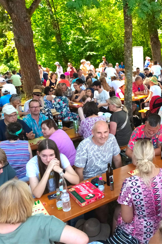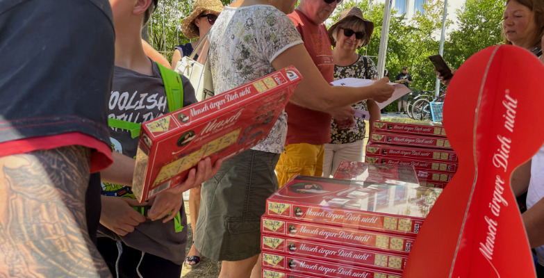 Mehr als 2009 Spielende mussten in Amberg zusammenkommen, um den Weltrekord aus Thüringen zu überbieten. Aus Platzgründen war also gegenüber 2017 ein Wechsel des Austragungsortes notwendig. Schauplatz war jetzt die Bleichwiese am Kongresszentrum, wohin die spielebegeisterten Menschen am Veranstaltungstag pilgerten. Ob Familien, Freundesgruppen oder Vereine: Menschen verschiedensten Alters nahmen an den bereitstehenden Bierbankgarnituren Platz – bei gut 35 Grad im Schatten. Da nicht für alle Plätze Sonnenschirme bereitstanden, »wanderten« viele der Tische prompt unter die schattenspenden Bäume am Rand der Bleichwiese.