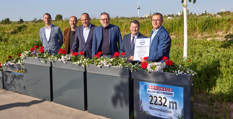 Mit exakt 2.232 Metern Länge zertifiziert Kuchenbecker dann den neuen Weltrekord für die »längste durchgehende Reihe aus Blumenkästen« und zeichnet Robert Köhler, Leiter Marketingkommunikation bei BAUHAUS, stellvertretend für alle Beteiligten mit einer RID-Rekordurkunde aus. Unter den Gratulanten waren auch Dr. Peter Kurz, Oberbürgermeister der Stadt Mannheim sowie Michael Schnellbach, Geschäftsführer der Bundesgartenschau Mannheim 2023 gGmbH.Und die Organisatoren bei BAUHAUS haben ihr Motto »Weltrekord fürs Klima« sehr ernst genommen. Die Blumenkästen wurden klimaneutral produziert, bei ausgewählten familiengeführten Gärtnereibetrieben bestellt und mit nachhaltig produzierter Pflanzenware bestückt. Das pflanzliche Substrat ist zudem ohne Torfzusätze. Die »Kasten-Kette« bleibt bis zum 22. Mai auf der BUGA 23. Ab dem 23. Mai verkauft das Unternehmen alle Weltrekord-Blumenkästen in »BAUHAUS«-Fachcentren in der Region für 10 EUR das Stück. Diese Summe geht von »BAUHAUS« komplett als Spende an die »Arbeitsgemeinschaft Natur und Umweltbildung« (ANU). Das RID gratuliert zum neuen RID-Weltrekord und wünscht dem Unternehmen weiterhin viel Erfolg und natürlich – eine hohe Spendensumme!