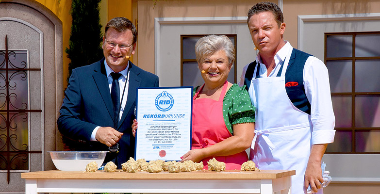 Kommentiert von Stefan Mross, schaffte es Johanna unter den wachsamen Augen von Rekordrichter Olaf Kuchenbecker 26 Knödel zu rollen und abzulegen. Einer musste aufgrund der zu geringen Größe abgezogen werden, so dass sich Johanna Bogensperger mit 25 geformten Knödeln den Weltrekord sichert für die »meisten in einer Minute gerollten Knödel«. Und Stefan Mross? verspeiste kurzerhand mit Genuss den von Kuchenbecker nicht gewerteten rohen Knödel, um gleich zu testen, ob diese bereits im ungekochten Zustand schmackhaft sind. Und sie waren, wie Stefan darauf bestätigte!