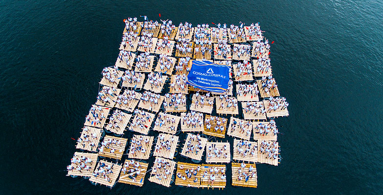 In Teamarbeit wurden zunächst aus Holzbalken, Seilen und Traktorreifen 63 Flöße zusammengebaut. Im nächsten Schritt wurden die einzelnen Konstruktionen zu einer riesigen schwimmenden Plattform verbunden, und kurzerhand zu einer Bühne umfunktioniert. Um sich den Weltrekord zu holen, mussten mindestens 250 Personen gleichzeitig einen Mitsing-Chor auf dieser schwimmenden Bühne bilden. Zweieinhalb Minuten lang musste das Team dort unisono zu einem Original-Playback singen. Passend zum Firmenevent war an diesem Tag »We Are Family« von Sister Sledge der Titel der Wahl.