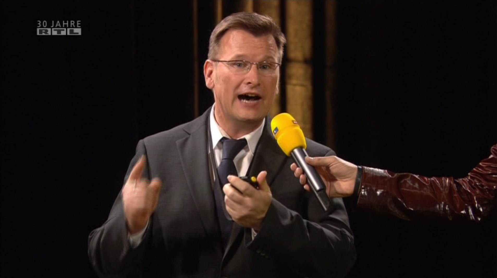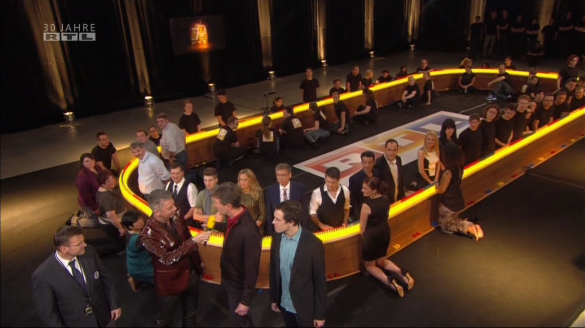 Beim Rekordversuch in der RTL-Jubiläums-Sendung sorgt TV-Schiedsrichter Olaf Kuchenbecker für die Einhaltung der Rekordregeln, während Heiko „Formel 1“ Waßer das Geschehen für Thomas Gottschalk und die Zuschauer kommentiert.