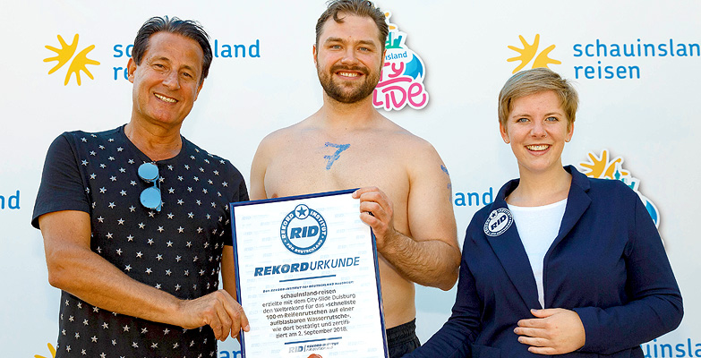 Bei bestem Sommerwetter mit strahlendem Sonnenschein und Temperaturen um 27 Grad holte sich Reiseveranstalter »schauinsland-reisen« am 2. September 2018 mit dem »City Slide« in Duisburg (D) den Weltrekord im »schnellsten 100-m-Reifenrutschen auf einer aufblasbaren Wasserrutsche«.