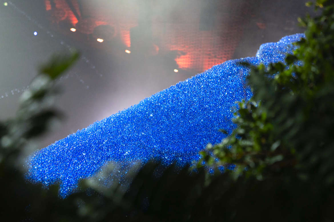 Diese sogenannten Wasserperlen werden im Haushalt üblicherweise zu Dekorationszwecken verwendet, beispielsweise in Vasen – dann allerdings in kleineren Stückzahlen. Bei der Installation hier kamen dagegen rund 150 Millionen der glitzernden Perlen zum Einsatz. In einem geschlossenen Kreislauf wurden die Wasserperlen durch ein Pumpensystem immer wieder nach oben transportiert, um dann wiederum den Wasserfall hinunter zu stürzen.