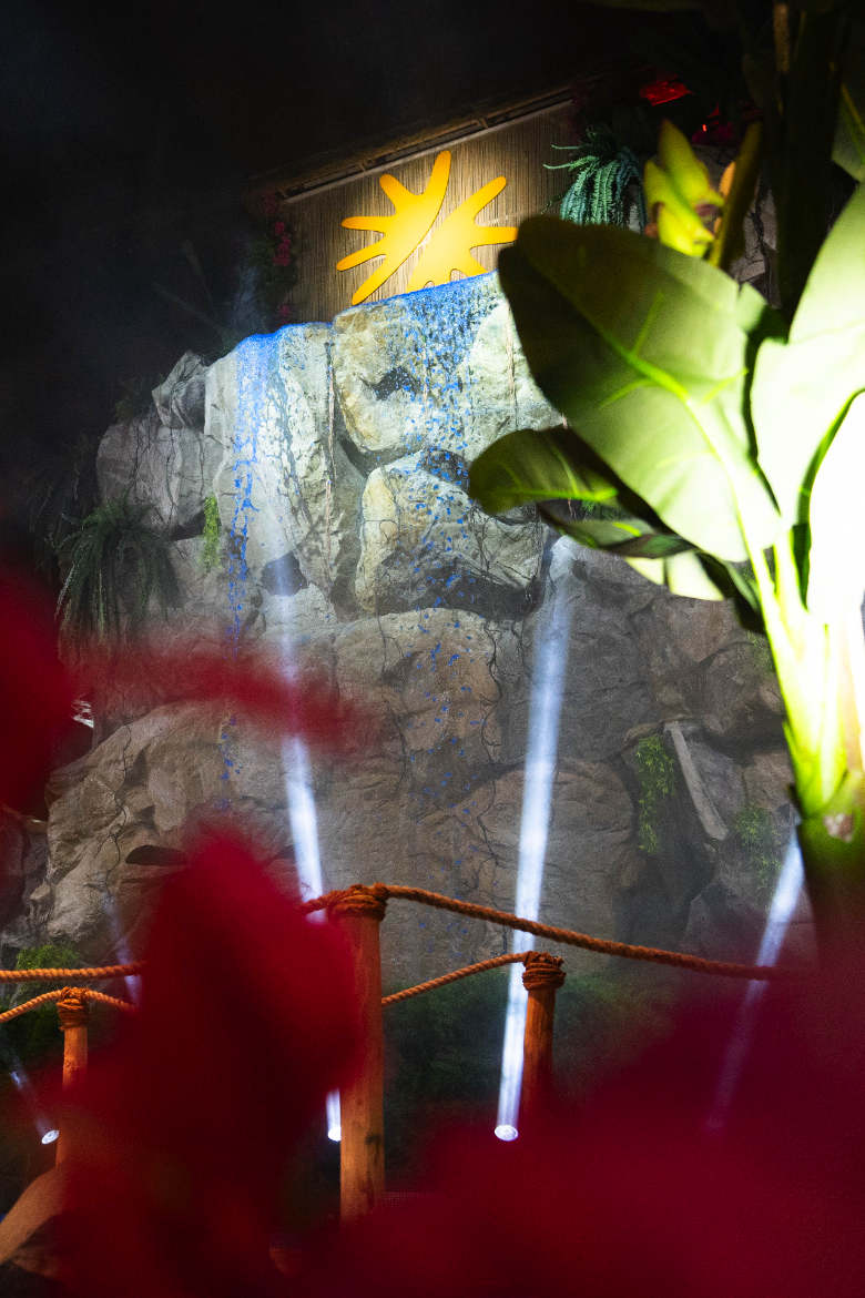 In der Mitte der Bühne thronte das potentielle Rekordobjekt. Mithilfe künstlicher Felsen war nach monatelanger Planung ein künstlicher Wasserfall in naturnaher Optik geschaffen worden. Als Medium wurden kleine Gelperlen statt Wasser verwendet.