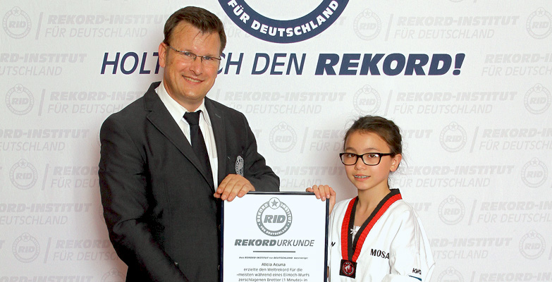 Und folgerichtig gelang es Alicia, am 8. Juni 2016 auf einer Veranstaltung ihrer Sportschule Mosan e.V. in Hamburg in 90 Sekunden 16 Bretter mit der Faust zu zerschlagen, während sie ein rohes Hühnerei mit der gleichen Hand in die Luft warf, um es nach jedem Schlag wieder aufzufangen – Weltrekord für die »meisten in 90 Sekunden beim Ei-Hochwerfen zerschlagenen Bretter«.