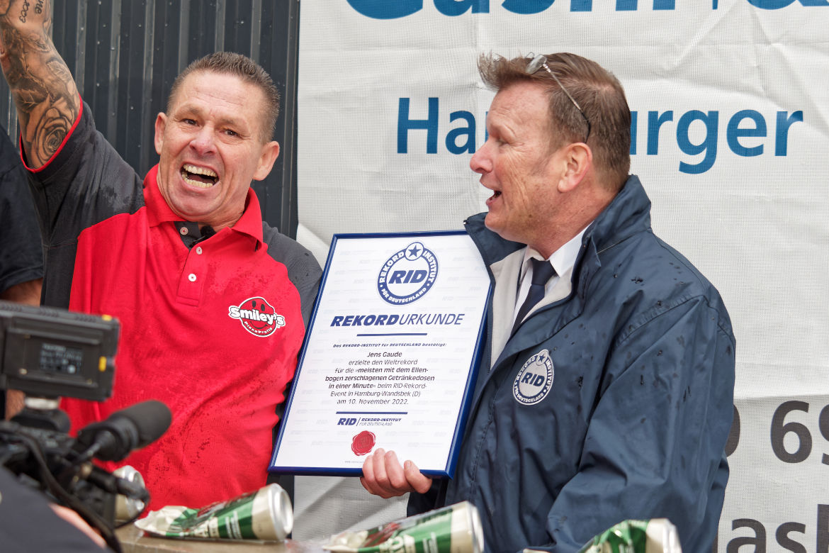 Exakt 60 Sekunden später endete der Rekordversuch und Kuchenbecker zählte die vollständig zusammengedrückten Getränkedosen. Mit insgesamt 113 Stück zertifizierte er den neuen Weltrekord für die »meisten mit dem Ellenbogen zerschlagenen Getränkedosen in einer Minute« und zeichnete Jens Gaude mit einer verdienten RID-Rekordurkunde aus.Fotos: Oliver Klesy