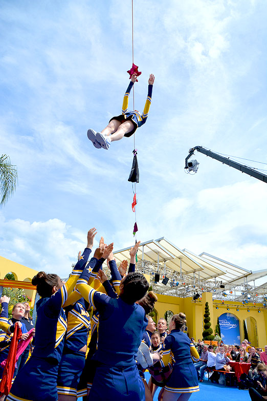 Ausgerechnet im sonnenverwöhnten Rust, ausgerechnet am 12. Juni 2016, dem Tag ihres großen Auftritts nach monatelangen Proben. Denn die Nässe bringt Gefahr, können doch die »Fliegerinnen« beim Landen von den nassen Armen der sogenannten »Bases« rutschen.