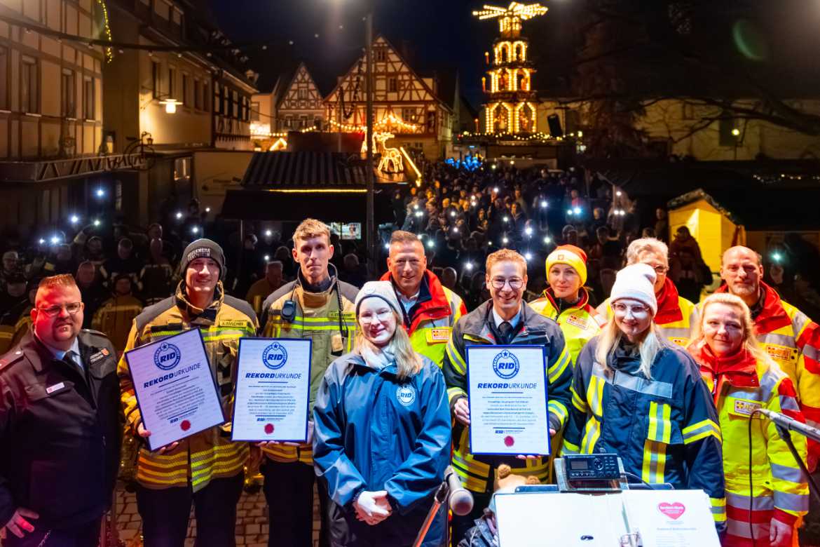 Unter großem Jubel zertifizierte Kuchenbecker mit dieser Distanz den »weitesten Non-Stop-Marsch in PSA mit angeschlossenem Atemschutzgerät (Einzel)«. Anschließend zeichnete sie die Neu-Rekordler sowie Josua Flierl, den 1. Vorsitzenden der Freiwilligen Feuerwehr Forchheim e.V. mit den RID-Rekordurkunden aus.Fotos: Feuerwehr Forchheim