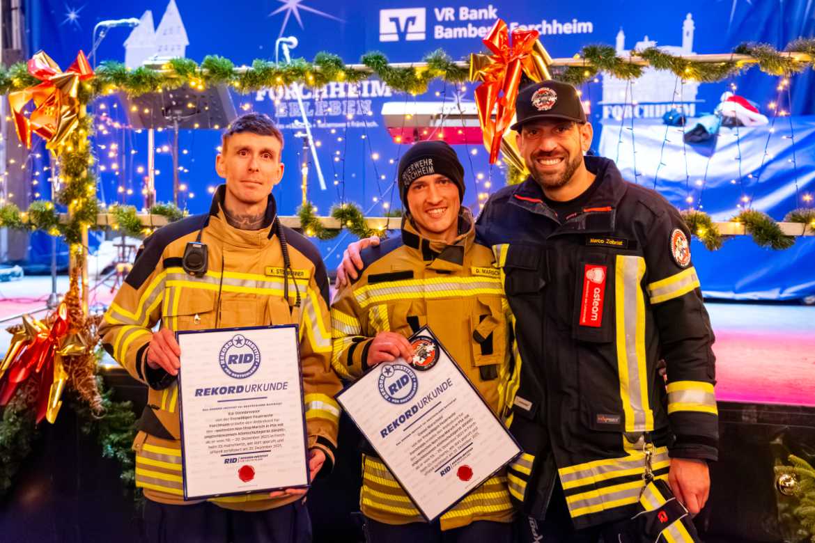 Ausdauernde Feuerwehrleute holen im oberfränkischen Forchheim (D) den Weltrekord: Am 19./20. Dezember 2025 marschierten Kai Steinbrenner und Daniel Marschner mehr als 100 Kilometer mit vollständiger Schutzausrüstung und angeschlossenem Atemschutzgerät.