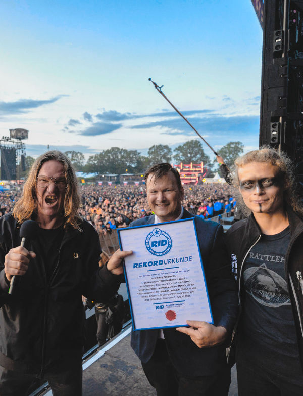 Es bedurfte einiger Trainingsrunden, bis die Metalheads tatsächlich die festgelegten Worte growlten und nicht nur begeistert grölten. Doch dann war der Rekordversuch erfolgreich und das Schallpegel-Messgerät dokumentierte sensationelle 110,3 dbA. Mit dieser Lautstärke zertifizierte RID-Rekordrichter Kuchenbecker den Weltrekord für den »lautesten Growl einer Menschenmenge (Heavy Metal)« und zeichnete Thomas Jensen stellvertretend für die »Growling Creatures« und alle teilnehmenden Fans mit einer RID-Rekordurkunde aus.Übrigens: Dieser Weltrekord war schon der zweite, der in Verbindung mit dem »Holy Ground« von W:O:A erzielt wurde. Im letzten Jahr gelang über dem Gelände das »höchstgelegene Luftgitarrensolo« in einem Heißluftballon.