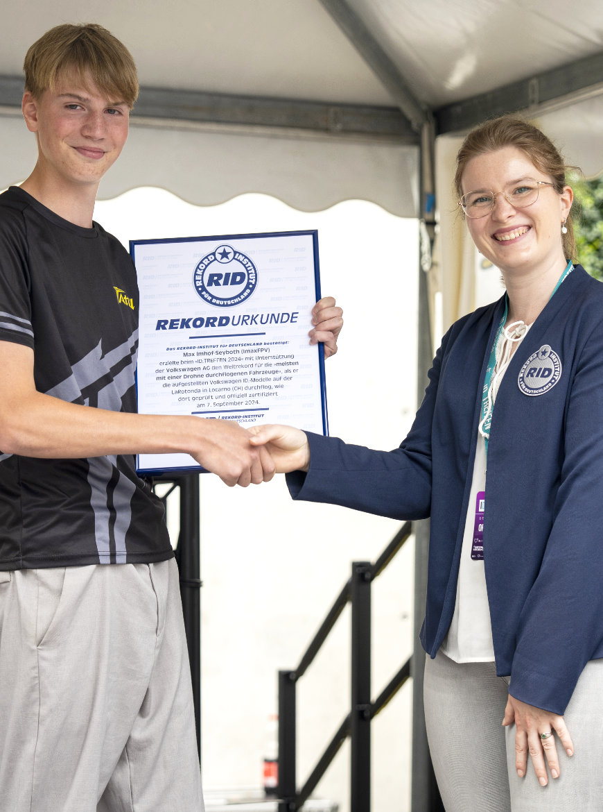 Ein letztes Mal atmete Max Imhof-Seyboth tief durch und startete seine Beta FPV Pavo 25 V2-Drohne. Er ließ sie durch die 26 Autos flitzen – dann der Wendepunkt. Mit kollektivem Daumendrücken gelang die Wende und Max düste zurück zum Start. Als er nach 1:03,28 Minuten sicher wieder gelandet war, brach das Publikum in Jubel aus.Mit 52 Autos zertifizierte Rekordrichterin Kuchenbecker den neuen Weltrekord für die »meisten mit einer Drohne durchflogenen Fahrzeuge«. Sofort zeichnete sie den Neu-Rekordhalter mit seiner verdienten Rekordurkunde aus.