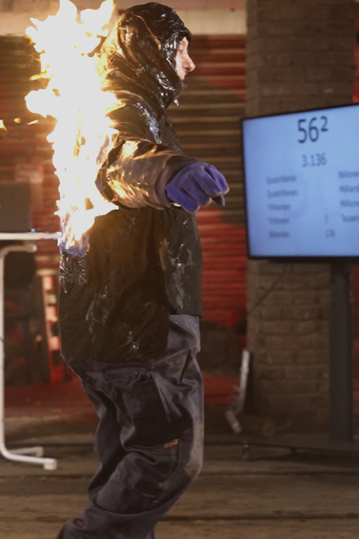 Bei der gewählten Rekordkategorie steht der Oberkörper des Rekordjägers vollständig in Flammen, während er gleichzeitig im Kopf Potenzen ausrechnet, also eine beliebige vorgegebene Zahl so oft wie möglich mit sich selbst multipliziert. Selbstverständlich ist der Rekordjäger dabei mit mehreren Schichten Schutzkleidung und reichlich Wassergel professionell vor direkter Flammenhitze geschützt. Dennoch wird es am Rücken immer heißer und die Ergebnisse der Potenzreihe müssen weiterhin korrekt berechnet und genannt werden. Für einen erfolgreichen Weltrekord der neuen Kategorie muss Gamm mindestens 40 Sekunden lang in »Feuer und Flamme« rechnen.