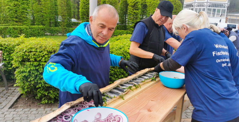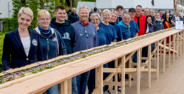 Dennoch wollten die Rügener bei ihrem Weltrekordversuch das Rekord-Fischbrötchen der Nachbarinsel Usedom in der Fläche übertrumpfen. Dort hatte Fischsommelier André Domke 2023 sein Bismarckheringsbrötchen in Original-Proportionen 3 Quadratmeter groß präseniert. Bei einer Breite von 12 cm mussten die Rekordjäger also einiges an Länge auftischen. Daher arbeitete das Team um Markus Pigard und Edda Brüdgam vom Fremdenverkehrs- und Gewerbeverein Göhren ab fünf Uhr morgens an der Fertigstellung des Rekordobjektes. Es gab einiges zu tun!Da das extralange Fischbrötchen nach den Rekordregeln aus einem Stück bestehen muss, wählten die Rügener eine ungewöhnliche Methode zur Verbindung der einzelnen Teile. Die Stoßkanten der einzelnen Baguettes wurden mit einer Extraschicht Teig zusammengeklebt, bzw. umhüllt und anschließend mit Bunsenbrennern gebacken. Kreativ und wirksam, denn so entstand ein durchgängiges, schmales Brötchen, was beim Rekordversuch mit über 40 Kilogramm Bismarckhering, Rucola-Salat und Zwiebeln belegt wurde. Alles unter den wachsamen Augen von RID-Rekordrichterin Ricarda Pastuzek, die zur Rekordprüfung nach Rügen gekommen war.