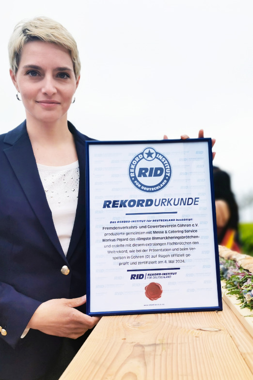 Sorgfältig vermaß die Rekordrichterin das fertige Bismarckheringsbrötchen: Exakt 30,95 Meter war es lang. Damit erzielte der »Fremdenverkehrs- und Gewerbeverein Göhren e.V.« gemeinsam mit »Messe & Catering Service Markus Pigard« den neuen Weltrekord für das »längste Bismarckheringsbrötchen «. Feierlich zeichnete Pastuzek die Veranstalter mit der RID-Rekordurkunde aus.