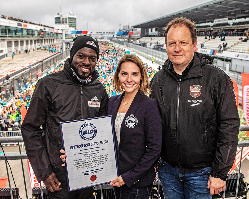 Nach dem Motto »Breathe. Focus. Weltrekord!« wurde die Veranstaltung am Nürburgring bereits vor dem eigentlichen Lauf mit einem erfolgreichen Weltrekordversuch eingeläutet. Exakt 1.956 Teilnehmer kamen in der Startgasse unter Anleitung des bekannten Motivationscoaches Hans Sarpei und der fachkundigen Betreuung durch Yoga-Lehrerin Nicole Hoberg zum »größten Atem-Meditations-Kurs der Welt« zusammen. RID-Rekordrichterin Eva Ricarda war vor Ort und zertifizierte die Massenbestleistung noch am Ring mit der begehrten RID-Weltrekordurkunde.