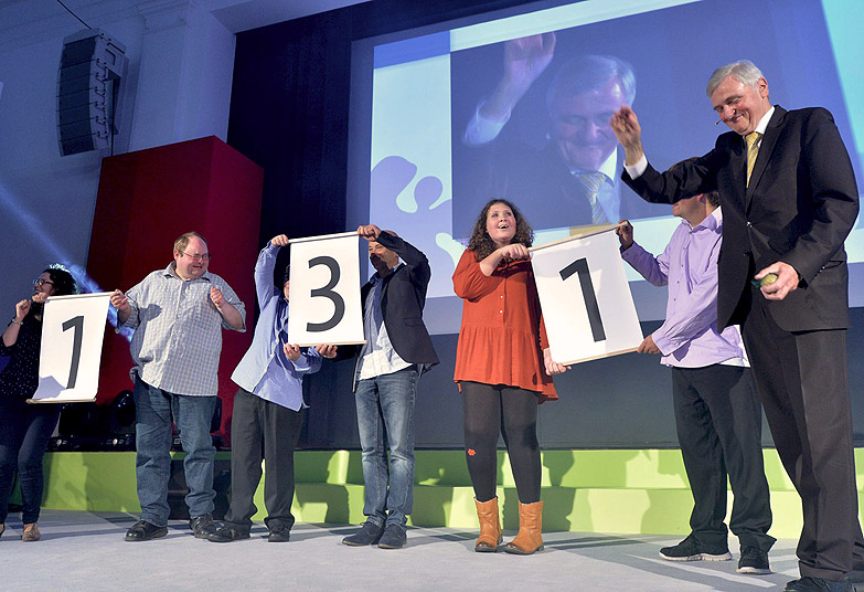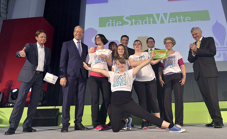 Auch die Aktion Mensch konnte als Kooperationspartner und Förderer gewonnen werden, und so wurde die Stadtwette am 25. September 2015 in einem von Rudi Cerne moderierten großen Galaabend in der Orangerie in Fulda mit zahlreichen Showeinlagen gebührend gefeiert, und dort die inklusiven Preisträger präsentiert.