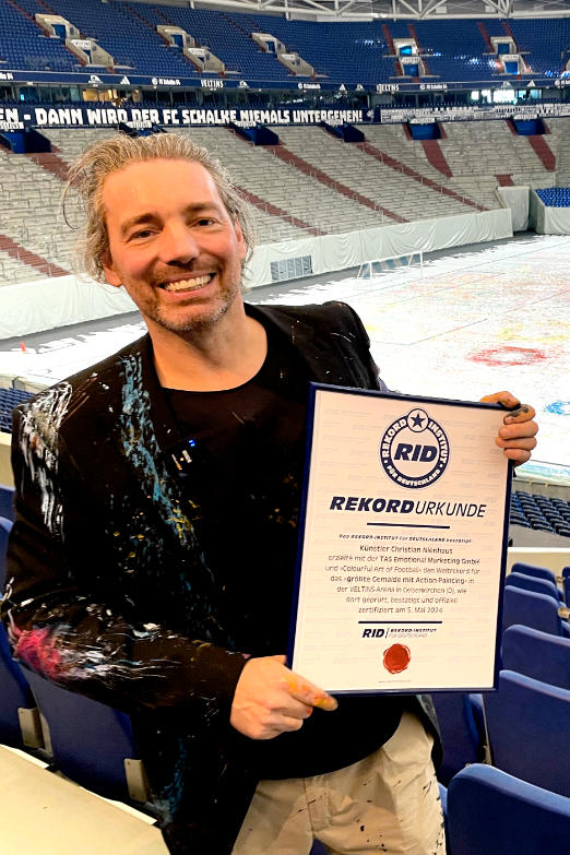 Auch die VELTINS-Arena in Gelsenkirchen (D) ist als Austragungsort vorgesehen. Der renommierte Künstler Christian Nienhaus stammt ebenfalls aus Gelsenkirchen und hat in der Arena zur Einstimmung auf die Europameisterschaft 2024 gemeinsam mit der TAS Emotional Marketing GmbH und weiteren Sponsoren ein besonderes Kunst-Projekt auf die Beine gestellt. Für dieses sollte in der Arena am 5. Mai 2024 ein riesiges Gemälde mithilfe einer ganz besonderen Technik entstehen, um im Idealfall als RID-Weltrekord für das »größte Gemälde mit Action-Painting« zertifiziert zu werden.