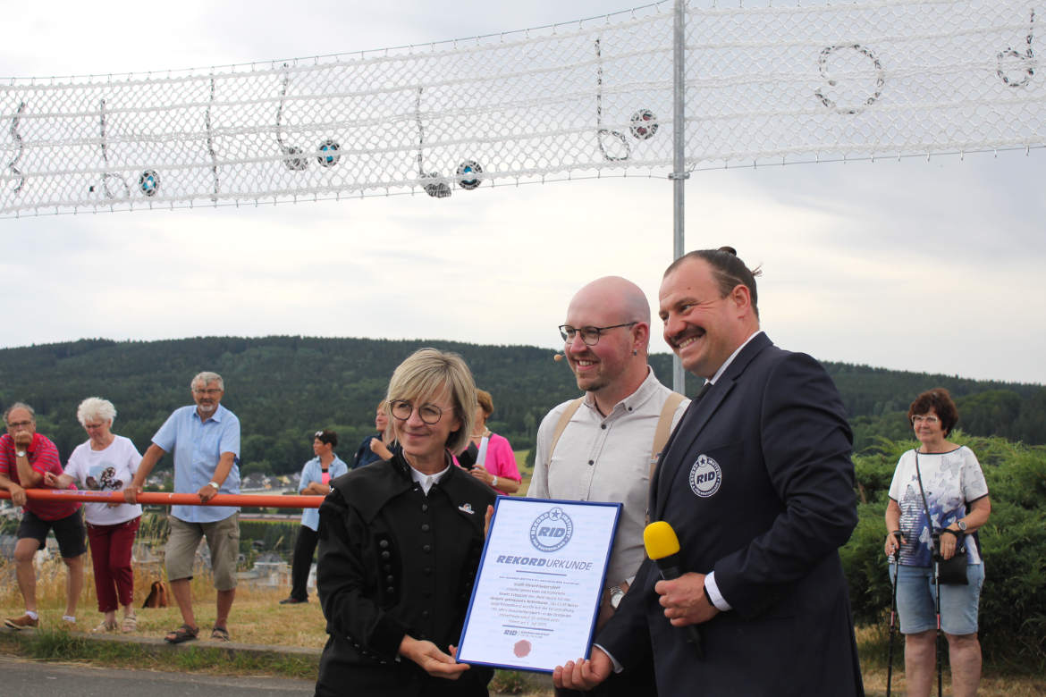 Das Band wurde an 16 Masten für alle gut sichtbar horizontal aufgehängt. RID-Rekordrichter Lasse Philippeit war nach Ehrenfriedersdorf (D) gekommen, um den Rekordversuch zu überwachen und im Erfolgsfall zu zertifizieren. Der Familientag zum 30-jährigen Jubiläum des Besucherbergwerks Zinngrube Ehrenfriedersdorf lieferte den passenden Rahmen für den Rekordversuch. Nach der Vermessung des Bandes verkündet Rekordrichter Philippeit das Ergebnis: