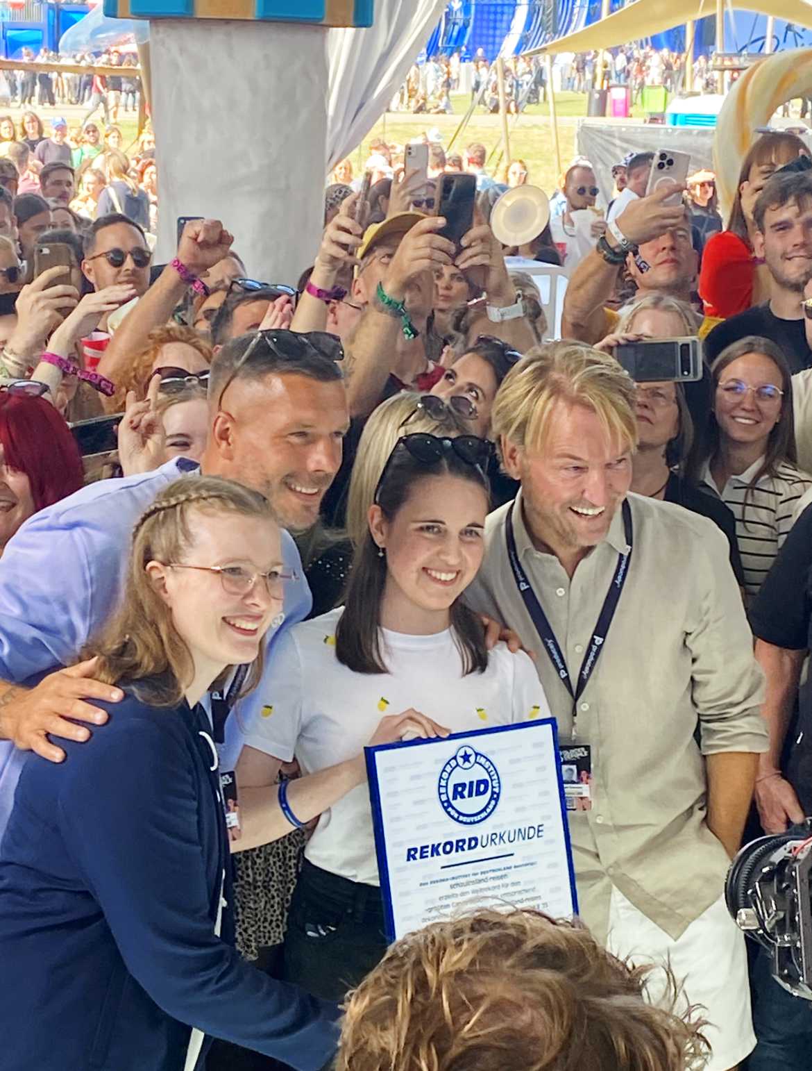 RID-Rekordrichterin Laura Kuchenbecker war zum Musikfestival gekommen, um sich von der Dekoration zu überzeugen und die Fläche prüfend nachzumessen. Am Festivalfreitag um 15:30 wurde feierlich das Ergebnis verkündet. Gespannt warteten darauf nicht nur zahlreiche Zuschauerinnen und Zuschauer, sondern auch die beiden Festivalveranstalter Markus Krampe und Lukas Podolski.Unter großem Jubel verkündete Rekordrichterin Kuchenbecker ihr Ergebnis – der Candy Beach maß exakt 1.202,64 Quadratmeter. Groß genug für den neuen Weltrekord, den Kuchenbecker sogleich zertifizierte. Stellvertretend für Veranstalter und Sponsoren wurde schauinsland-reisen Mitarbeiterin Fiona Bischof mit der RID-Rekordurkunde für den »größten Candy Beach« ausgezeichnet.