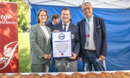Nach der Weltrekordzertifizierung zeichnete Kuchenbecker Isabelle Junge (Junge Die Bäckerei.) und Cord Wöhlke (BUDNI) stellvertretend für alle Beteiligten mit der RID-Rekordurkunde aus.Fotos: budni-UlrichSchaarschmidt (2); RID (1)