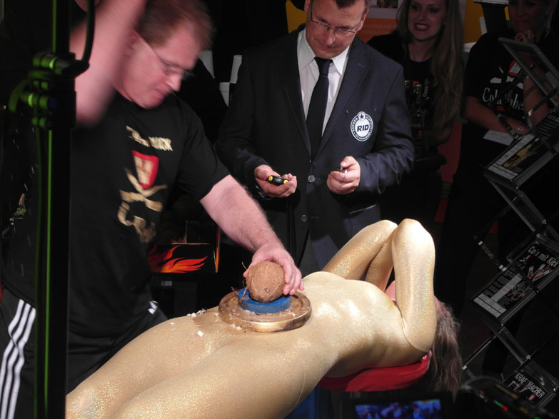 Mindestens zwanzig Nüsse waren gefordert, um in der neu geschaffenen RID-Rekordkategorie meiste in einer Minute auf dem Bauch einer Person zerschlagenen Kokosnüsse den Erstrekord zu erzielen.
