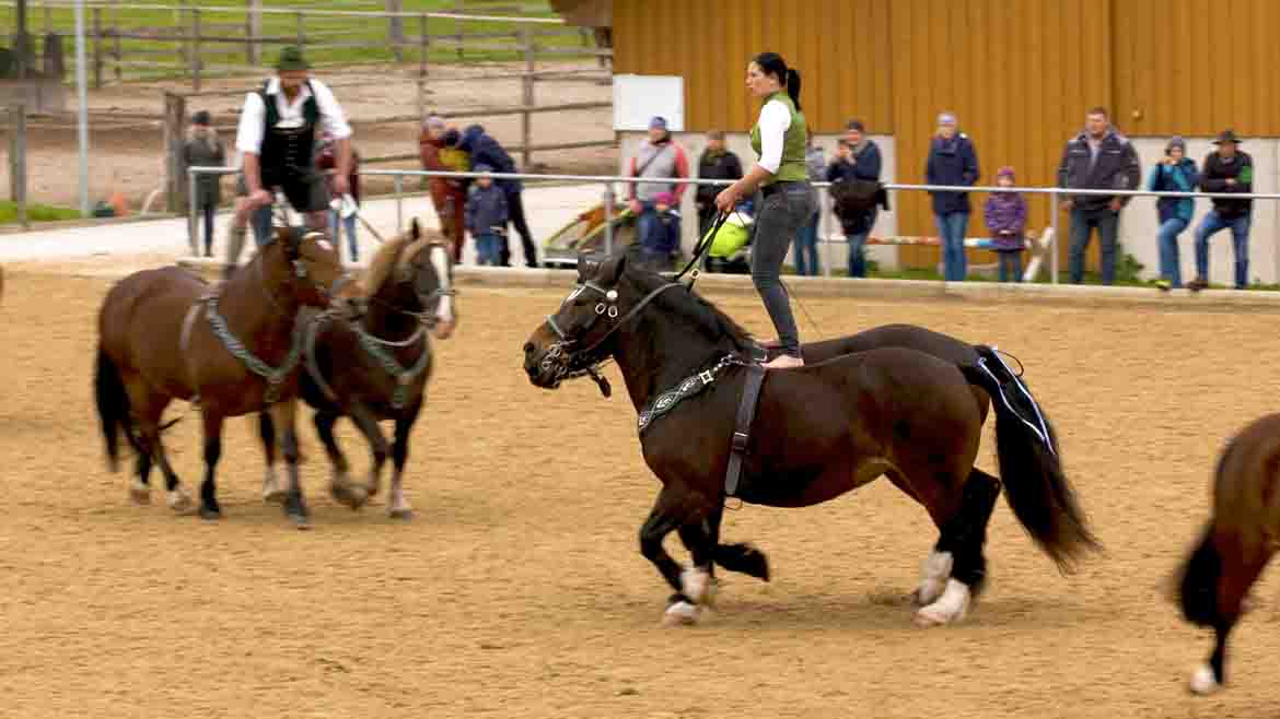 Seit nunmehr neun Jahren zeigt die »Oberländer Reitertruppe« aus Ohlstadt bei Murnau (D) ihr Können auf Events. Ihr Spezialgebiet: die Ungarische Post-Quadrille. Dabei steht ein Reiter jeweils auf dem Rücken zweier trabender oder galoppierender Pferde, die mit anderen Reitenden synchron in Formation gelenkt werden. Mit dieser Showeinlage möchten die Pferdenarren den Weltrekord erzielen für die nach Anzahl der Reitenden »größte Ungarische Post-Quadrille«.