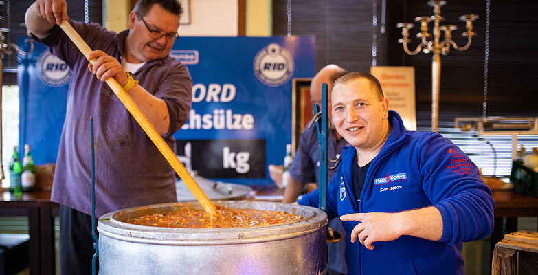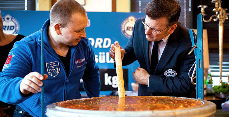 »Das Vorhaben ist geglückt: Die Riesenportion Fischsuppe nach Soljanka-Art riecht und schmeckt nicht nur lecker und wie eine normalgroße Portion ihrer Art, sondern sieht auch so aus. Unsere Rekordvorgabe ist mit 268 Litern sogar übererfüllt worden. Wir gratulieren Herrn Domke ganz herzlich zum neuen RID-Weltrekord«, so Kuchenbecker im Moment der Urkundenübergabe.