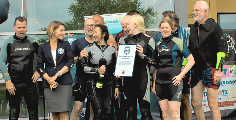 RID-Rekordrichterin Eva Ricarda übergab noch im Nidderbad die Rekordurkunden an den Verein, als Zeichen für die offizielle Anerkennung der Weltrekorde, und deren Aufnahme in das RID-Rekordarchiv.