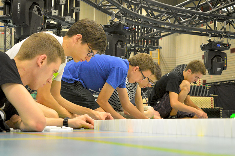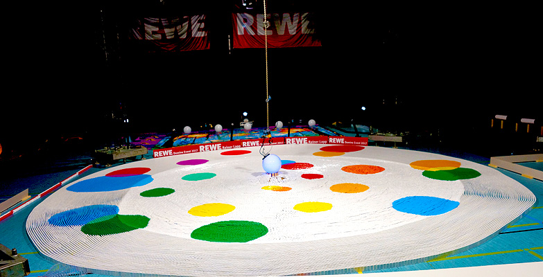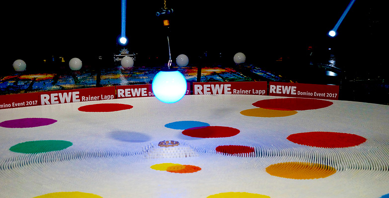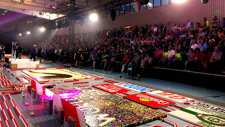 Wie im berühmten TV-Vorbild geht es beim »Spiel mit den Steinen« darum, bunte Bilder und Strukturen zuerst aus Dominosteinen aufzubauen, um sie dann in einer wohlkalkulierten Kettenreaktion spektakulär und fantasievoll einstürzen zu lassen. Die einschlägigen Videoclips erreichen im Internet ein Millionenpublikum. Spannend war es in der Tat am Abend des 11. August 2017, als der Rekordversuch nach dem »Anstoß« durch den Hauptsponsor, Kaufmann Rainer Lapp fast gescheitert wäre.