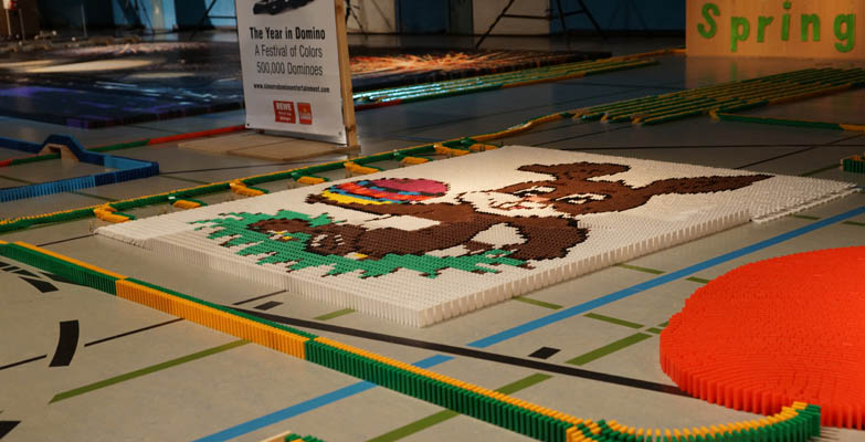 Doch kurz vor dem Anstoß der umfangreichen Kettenreaktion zum Thema »Jahreszeiten« ging noch einmal ein Raunen durch die Zuschauer in der ausverkauften Halle, als unter lautem Rauschen ein Dominokamin samt Weihnachtsmann an der Spitze in sich zusammenfiel. Bei der Reparatur konnten zwar einige der Steine wieder gestellt werden, aber insgesamt weniger, als es der ehrgeizige Plan der Domino-Bauer ursprünglich vorgesehen hatte.