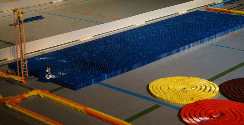 Ausgelöst durch den Geschäftsführer des Hauptsponsors Rewe, lief die Kettenreaktion in knapp zwanzig Minuten flüssig bis zum Schluss, wenngleich einige Domino-Felder nicht vollständig in sich zusammenfielen, und so nicht zur Rekordmenge gezählt werden können.