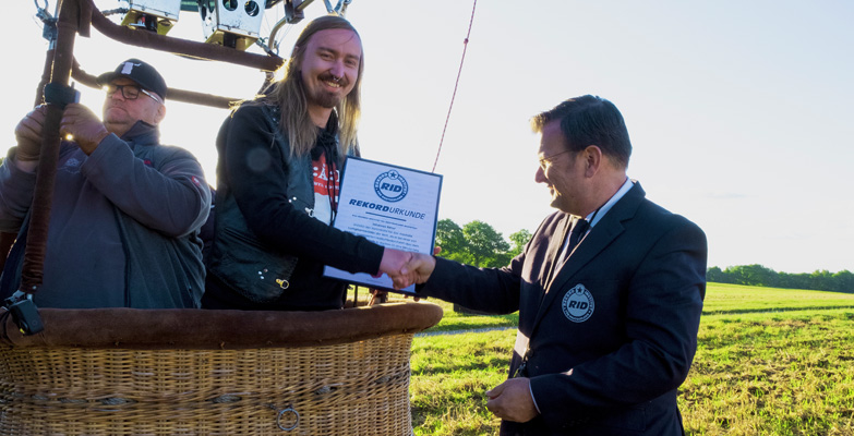 Begleitet von Ballonfahrer Helmut Krogmann aus Celle sowie NDR-Reporter und Kameramann Kevin Laske stieg Rekordjäger Johnny am frühen Morgen des 6. August 2022 in den schwarzen Heißluftballon. Nach dem Start um 6:16 Uhr schwebte das Luftgefährt hoch über Campingplatz, Bühnen und Metal-Fans hinweg. Beim Erreichen der erforderten Höhe von 300 Metern bekam Johnny sein Startsignal und legte los – zum eigens adaptierten Song »Gladiator« seiner Band »Rise of Kronos«. In die Spielzeit von 60 Sekunden hatte Johnny zahlreiche Riffs und coole Moves eingebaut – soweit der begrenzte Platz zuließ.Nach der Landung war RID-Rekordrichter Olaf Kuchenbecker gespannt auf die Sichtung von Höhenmesser und Videobeweis, um sich persönlich von der Performance des Musikers zu überzeugen.