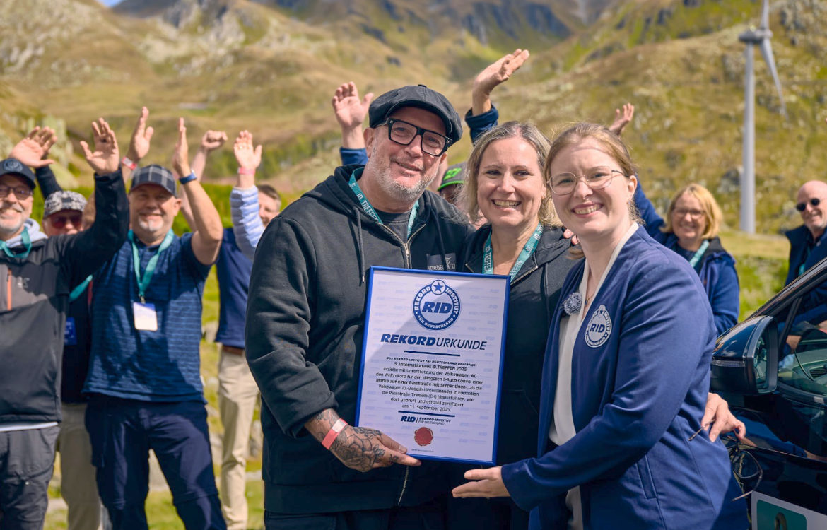 Stellvertretend für alle Beteiligten zeichnete sie Daniel und Maria Ott, die Organisatoren des ID. TREFFEN mit der verdienten RID-Rekordurkunde aus. So setzte die ID. Familie ein starkes gemeinsames Zeichen für Elektromobilität und Teamgeist – und feierte das 5. Jubiläum des Treffens gebührend mit einem Weltrekord.Fotos: Volkswagen AG (2); Robert Arnold (4)