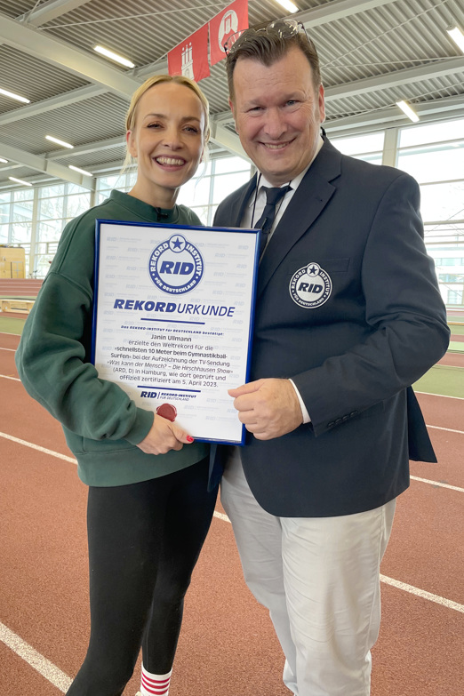 Janin Ullmann macht es spannend. Erst mit ihrem dritten und letzten Rekordversuch des Tages, bei dem Sie sich kurz vor dem Abrutschen mittels einer gewagten Körperdrehung über die Ziellinie schraubt, ist sie erfolgreich: mit 3,73 Sekunden erzielt Janine Ullmann den RID-Weltrekord für die »schnellsten 10 Meter beim Gymnastikball-Surfen« und wird von Olaf Kuchenbecker mit einer persönlichen Weltrekordurkunde ausgezeichnet.Fotos: WDR