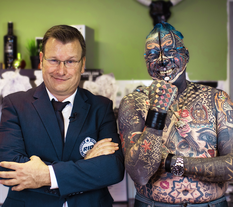 Wolfgang Kirsch ist 71 Jahre alt, wohnt in Berlin (D) und ist ehemaliger Postbeamter. Als Tattoo-Model »Magneto« hat Wolfgang schwarz gefärbte Augäpfeln, 86 Tätowierungen und 17 Implantate unter der Haut, von denen einige magnetisch sind. Vor allem aber ist Wolfgang Kirsch alias »Magneto« – Rekordhalter als »meisttätowierter Mann Deutschlands«.