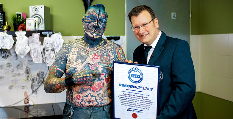 Dieser besondere Körpereinsatz sollte honoriert werden. Am 12. November 2019 kam RID-Rekordrichter Olaf Kuchenbecker mit einem Fernsehteam von »Heimat der Rekorde« (RBB, D) nach Berlin (D). Dort traf er »Magneto« in seinem Lieblingsstudio dem »Tattoostudio EdelSchmerz«, wo er sich vor laufender Kamera ein weiteres Tattoo stechen ließ, einen schwarzen Strich, der von der Stirn über die Nase läuft. Erst danach nahm Rekordrichter Olaf Kuchenbecker die Haut des Berliners genauestens unter die Lupe. Mit prüfendem Blick betrachtete er die Kunstwerke und untersuchte auch die Lücken zwischen den Motiven. Und siehe da: mit ca. 98% tätowierter Körperoberfläche ist »Magneto« alias Wolfgang Kirsch sogar der weltweit »meisttätowierte Mann (Ü70)« und erhielt noch an Ort und Stelle seine offizielle RID-Rekordurkunde.