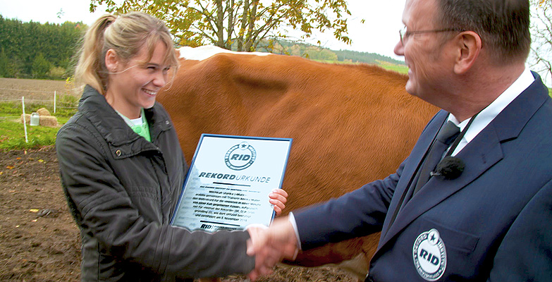 Wenn nicht Urmel als Ersatz für seine Mutter eingesprungen wäre. Souverän verteilte der Ochse einen Bussi nach dem nächsten. In der letzten Sekunde berührte die lange Zunge die Wange des letzten Helfers. So machte er mit 15 Küssen »den Rekord-Sack zu«, was Kuchenbecker sofort mit der RID-Rekordurkunde belohnte. Die glückliche Annika ist nun gemeinsam mit Urmel Weltrekordhalterin für die »meisten in einer Minute von einem Rind gegebenen Küsse«.