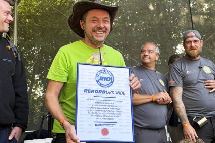 Und so konnte die alles entscheidende Weltrekordfahrt der Murmel, mit der die Kugelbahn auf ihre Funktion getestet wird, erst am Sonntagmorgen, dem 24. August 2025 gestartet werden. 11:28 Minuten benötigte dann die Kugel, um die Strecke vollständig und erfolgreich zu durchlaufen, bevor RID-Rekordrichterin Meike Janz den neuen Weltrekord mit exakt 2.868,64 Metern zertifizierte und das Vater-Kind-Orga-Team, allen voran den Vorsitzenden Volker Drefs sowie Andreas Nöthen mit der RID-Rekordurkunde auszeichnete.Fotos: Torsten Pung Photography (2), RID Meike Janz (3), Vater-Kind-Aktion e.V. (1)