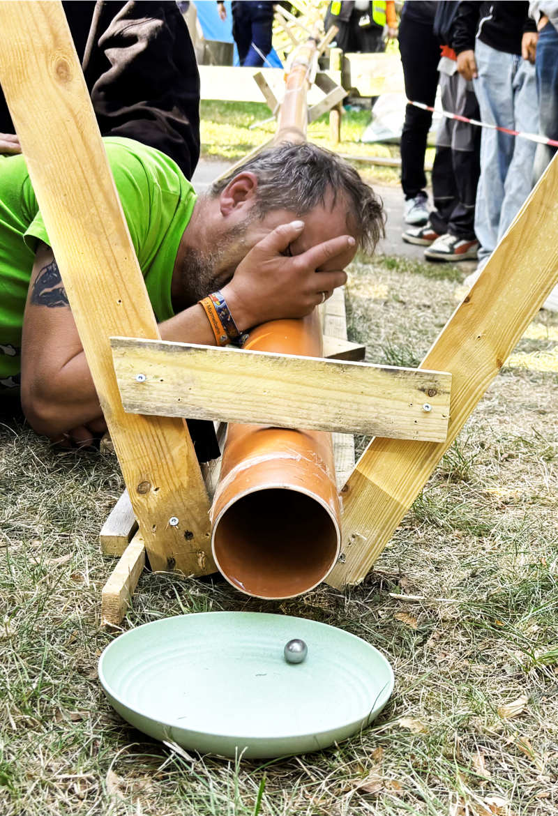 Bloß, wie verfolgt man die durch das Rohr rollende Kugel, die man nicht sieht? Dafür verteilten sich die Rekordler an der Bahn und lauschten mit dem Ohr am Rohr, um bei Geräusch die Hand zu heben. Damit wurde außen sichtbar gemacht, wie gut sich die Kugel fortbewegte – quasi eine kugelgetriebene La-Ola-Welle.Besonders nervenaufreibend war, dass die Kugel immer wieder bei verflixten 2.800 Metern zum Stehen kam – doch Aufgegeben kam für die Beteiligten nicht infrage. Insofern wurden zahlreiche Versuche gestartet, die Strecke und deren Gefälle zu optimieren. Doch an diesem Samstag war die Kugel nicht mehr zu überzeugen, die Durchfahrung der Strecke komplett zu machen.