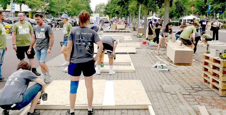 Am Morgen des 13. August 2022 ist von den zukünftigen Häusern allerdings noch nichts zu erkennen. Allerdings liegt jede Menge Baumaterial auf dem Toom-Parkplatz in Berlin-Friedrichshain (D) bereit: 12 Paletten OSB-Platten, 30 kg Schrauben, 50 Liter Farbe und 800 Holzleisten. In maximal 12 Stunden Zeit sollen daraus im Rahmen des Weltrekordversuches zehn »Little Home« entstehen. Neben dem Zeitrahmen ist Bedingung für einen erfolgreichen Weltrekord, dass dabei funktionstüchtige Minihäuser entstehen, die tatsächlich an Bedürftige gegeben werden.